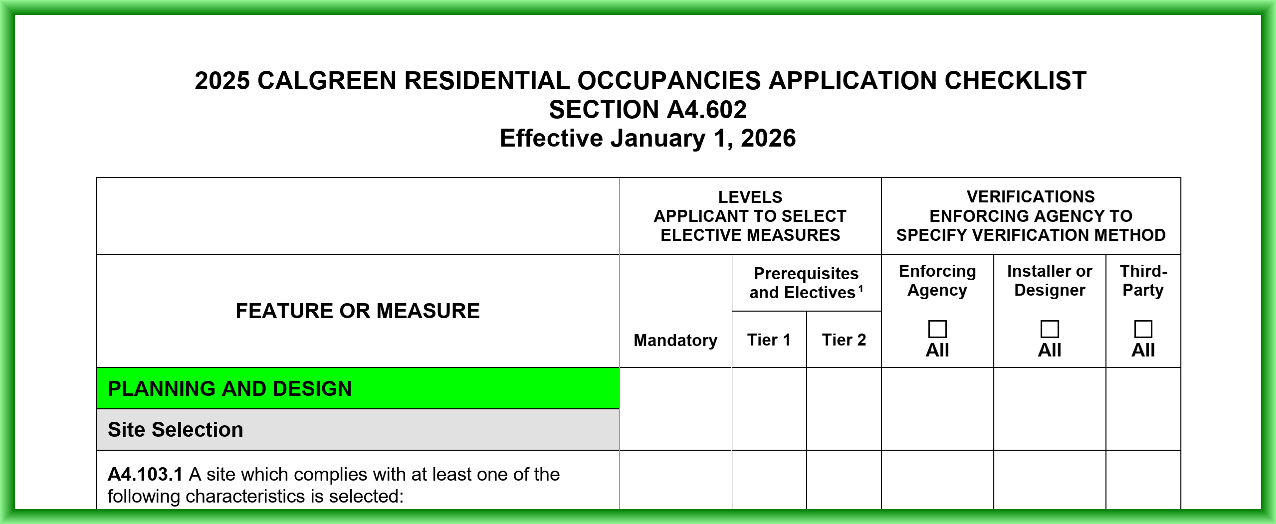 - HCD-SHL-625c: The 2025 CalGreen Residential Occupancies Application Checklist, including Tier 1 and Tier 2 (see image above)